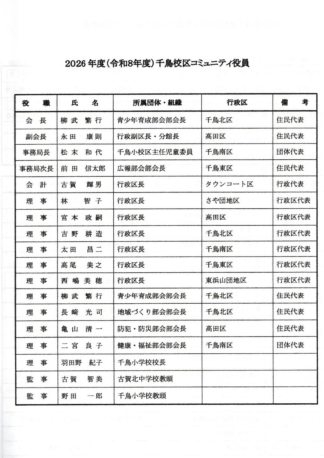皆様には、平素より千鳥校区コミュニティにご協力をいただきありがとうございます。 去る、3月29日(日)午後7時より千鳥苑にて令和7年度の定期総会を開催しましたことをご報告させていただきます。 来賓として、まちづくり推進課課長 牟田口様にご出席をいただきました。 代議員数160名に対し、出席者50名・委任状83名、合計133名の有効代議員数となり総会成立となりました。 ダウンコート区の中村様に議長をお願いして議事の進行を行い、議案のすべてに出席者のご承認をいただくことができました。 なお、今回の総会では、役員の方々のご努力により、以前からの課題でありました「年度内に総会を開催する」という目標が達成されたこともご報告させていただきます。 当日ご参加いただいた代議員の皆様、総会の準備に係わってくださった役員の皆様、本当にありがとうございました。 皆様には、これまで以上に千鳥校区コミュニティへのご支援をいただきますようお願いいたします。